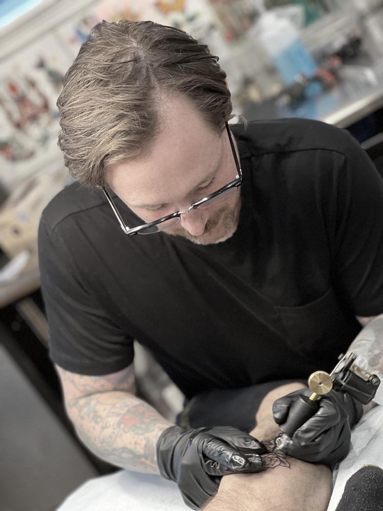 In August 2024, he made the intentional decision to return to tattooing. Together, we agreed the right approach was to rebuild from the ground up - to embrace the discipline of the medium and re-earn his place within it. Since then, Mike has approached each day with humility, focus, and a genuine commitment to mastering the craft.